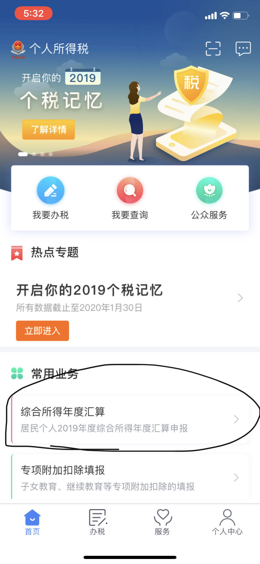 2、登录个人所得税APP,点击首页的“综合所得年度汇算”,该功能适用于居民个人2019年度综合所得年度汇算申报。