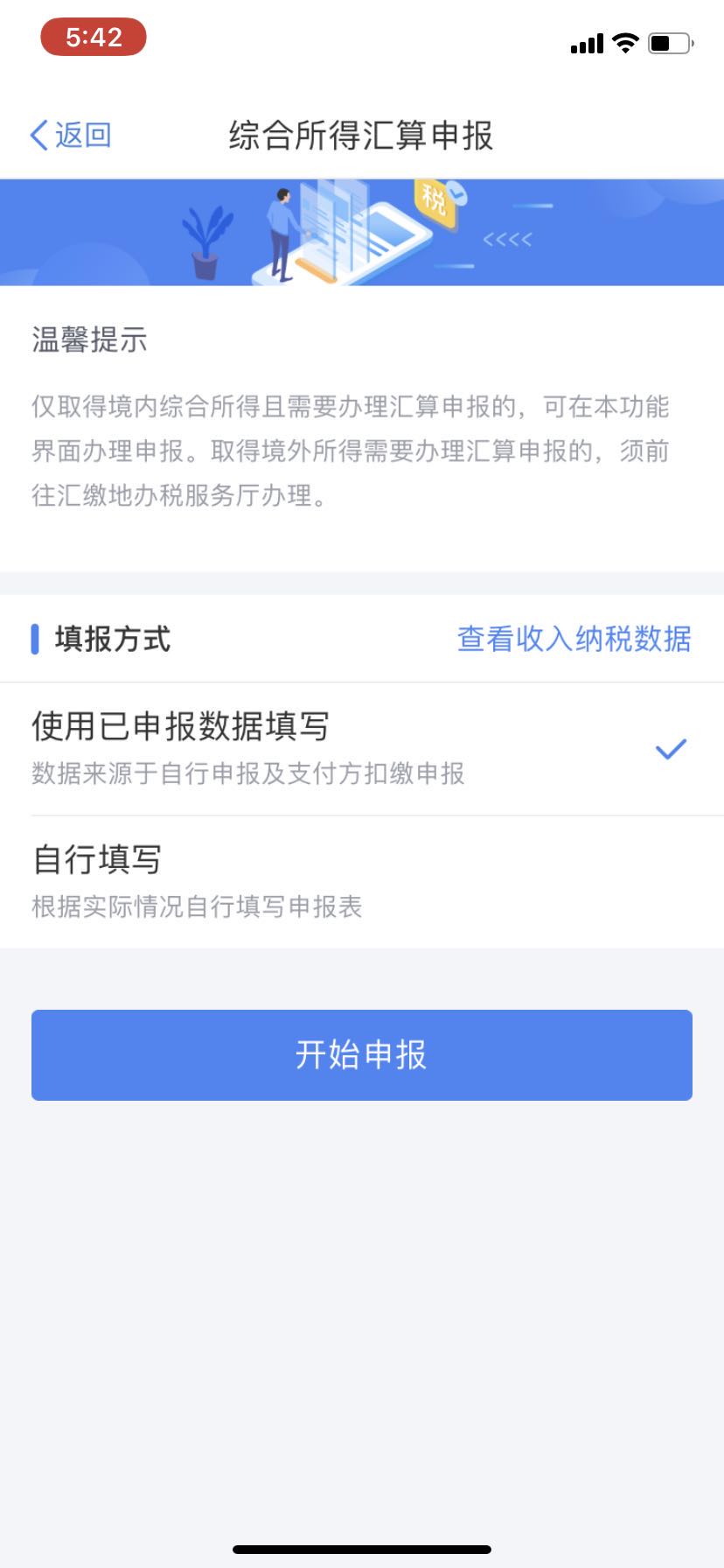 1、进入“综合所得汇算申报”页面,页面提示信息:仅取得境内综合所得且需要办理汇算申报的,可在本功能界面办理申报。取得境外所得需要办理汇算申报的,须前往汇缴地办税服务厅办理。