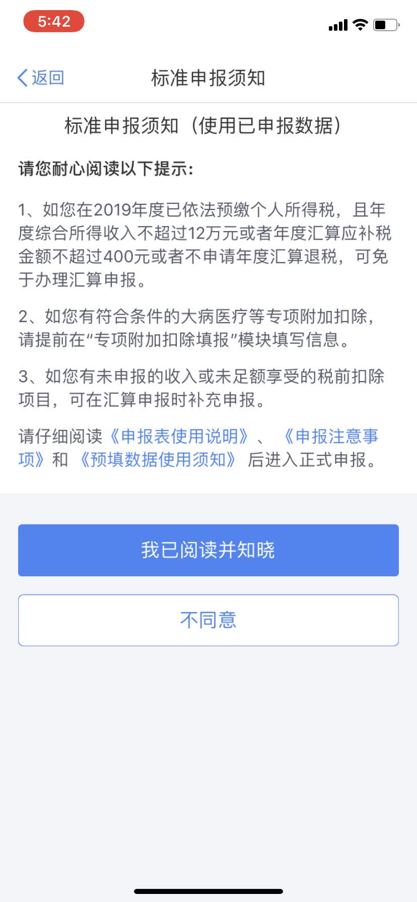 (1)如您在2019年度已依法预缴个人所得税,且年度综合所得收入不超过12万元或者年度汇算应补税金额不超过400元或者不申请年度汇算退税,可免于办理汇算申报。