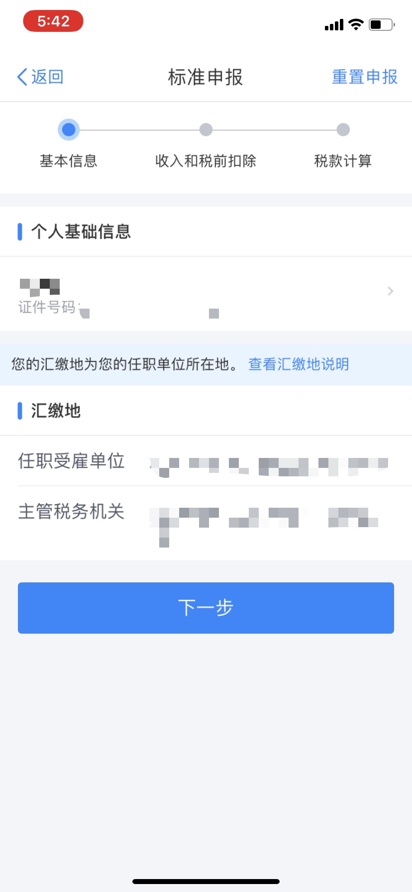 2、标准申报可分为三个步骤,【基础信息】、【收入和税前扣除】、【税款计算】