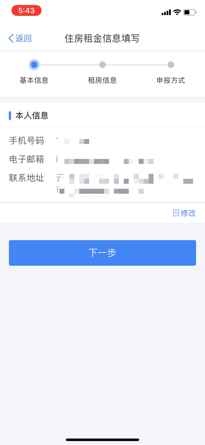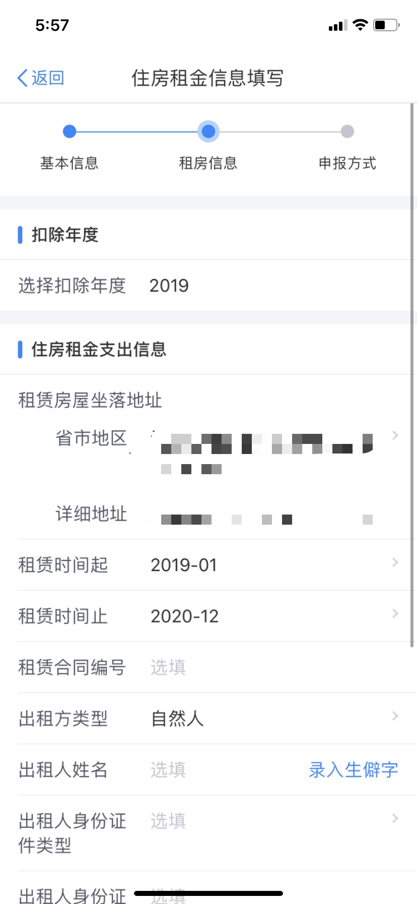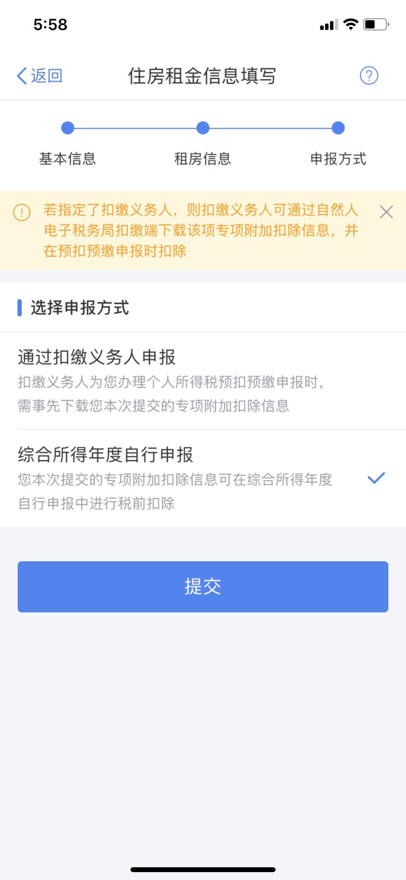 以新增“住房租金”专项附加扣除为例,具体操作步骤:基本信息—租房信息—申报方式。
