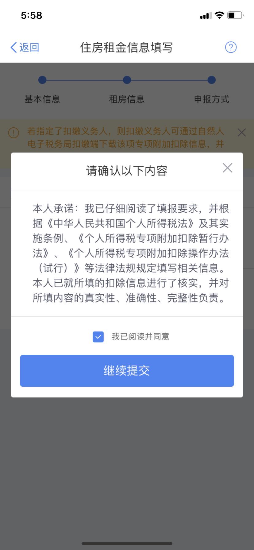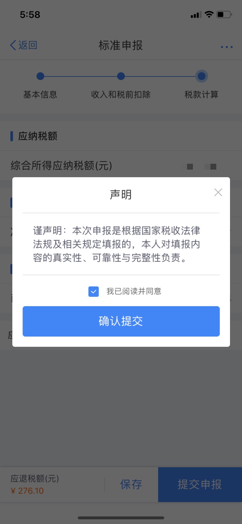 在确认提交前,有一则声明:本次申报是根据国家税收法律法规及相关规定填报的,本人对填报内容的真实性、可靠性与完整性负责。