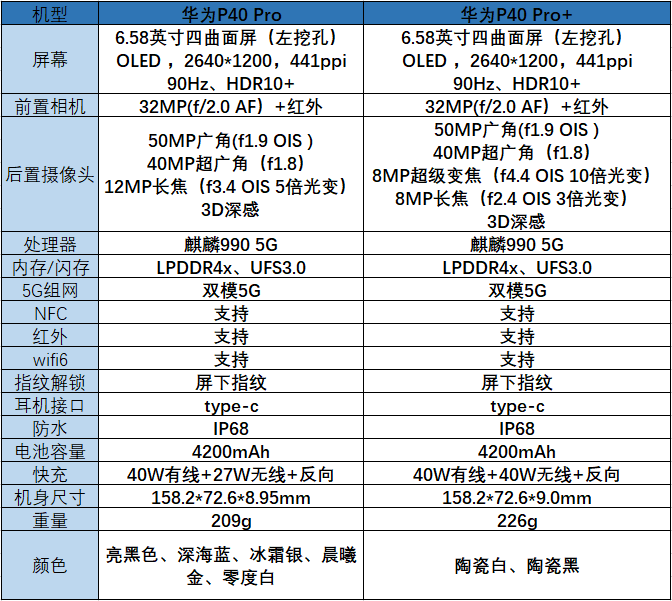 1、外观方面:华为p40pro后置四摄,pro+后置五摄,摄像头模组不一样,华为p40pro采用玻璃机身,颜色有亮黑色、深海蓝、冰霜银、晨曦金、零度白五种,华为p40pro+是陶瓷机身,有陶瓷白和陶瓷黑两种配色。华为p40pro机身尺寸为158.2*72.6*8.95mm,重209g,p40pro+机身尺寸为158.2*72.6*9.0mm,重226g。