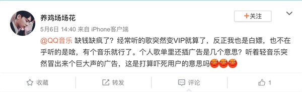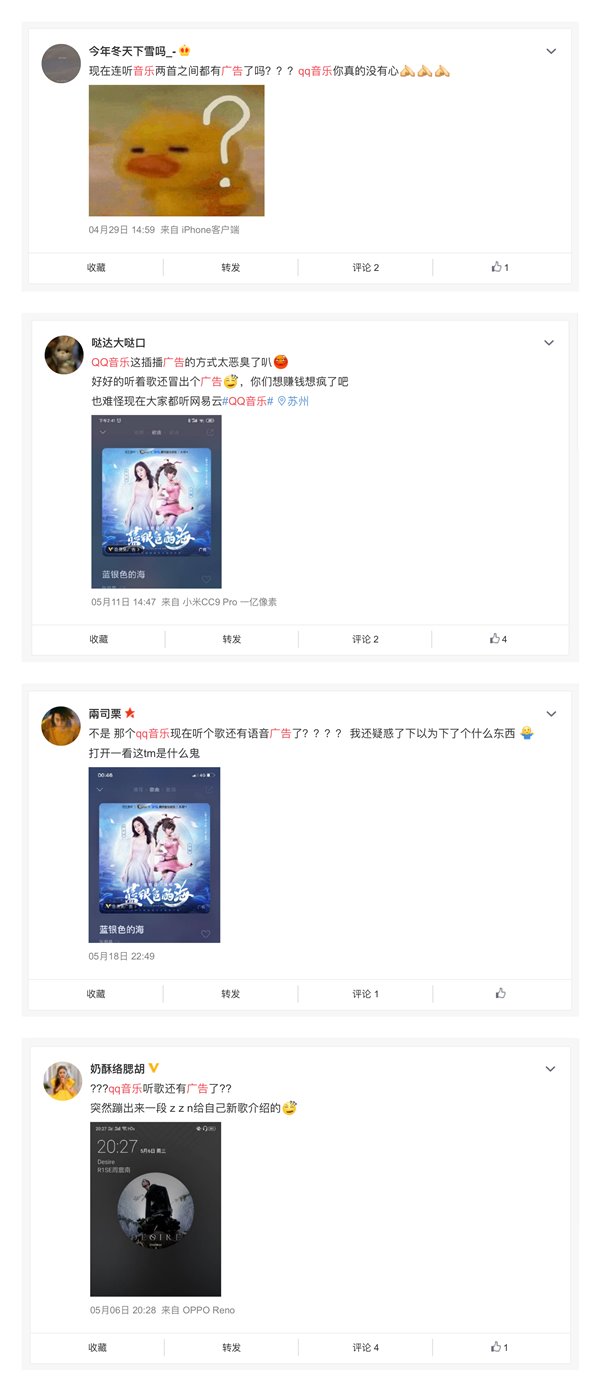通过搜索发现,QQ 音乐在播放中途插播语音广告的行为最早可追溯到今年四月底,当时已经有用户在微博上吐槽这一现象。QQ