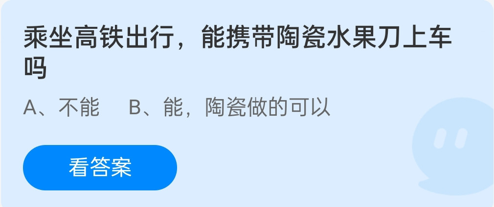 蚂蚁庄园12月16日的问题分别是:乘坐高铁出行,能携带陶瓷水果刀上车吗?高铁速度这么快,却不用安全带,主要是因为?下面昊普教程小编就为大家带来问题的解答,快来一起看看吧。