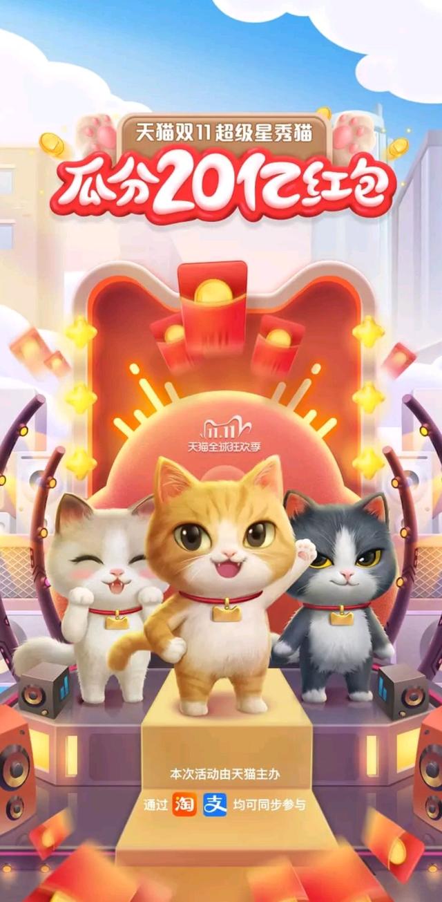 4、开奖说明:获得开奖资格的用户,需在2020年11月11日14:00:00——2020年11月11日21:59:59期间内,进入“双11超级星秀猫”活动页面进行开奖,抢红包奖励。