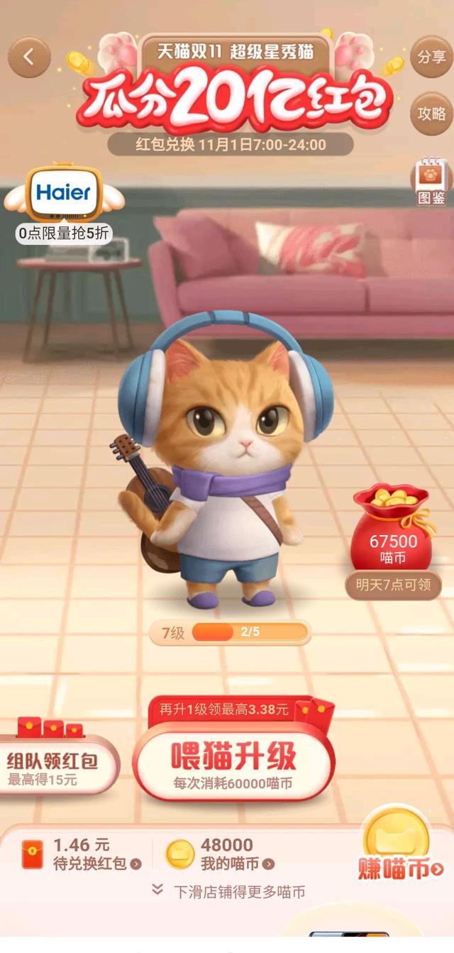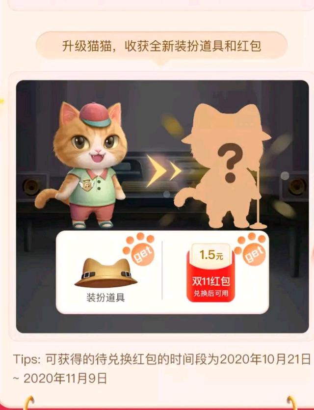 第二步,就是升级猫了,每升一级有道具和随机红包