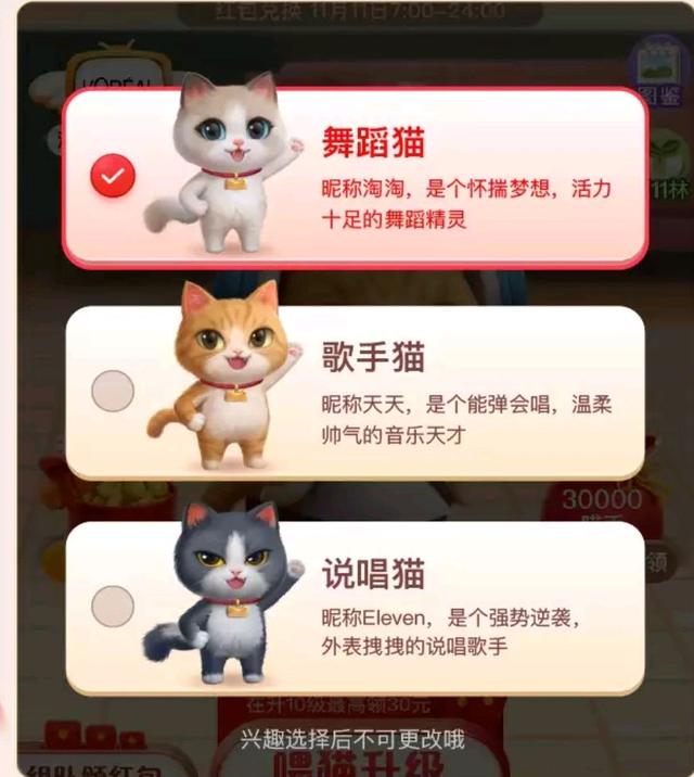 养猫分为几个步骤,第一选择兴趣班,有舞蹈猫,歌手猫,说唱猫三种,只能选择其一,且不能更改。