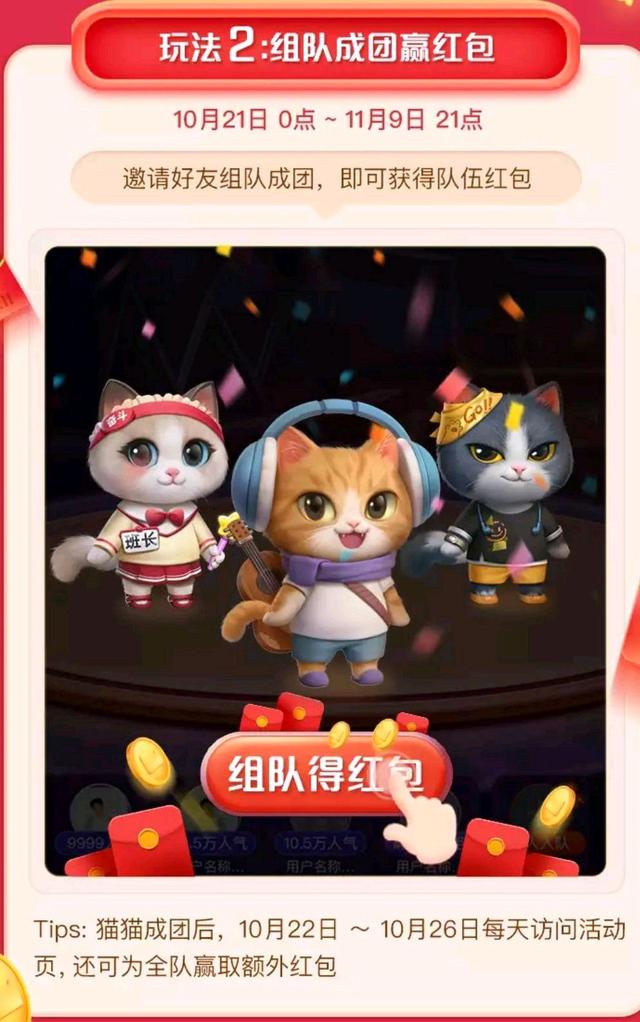 第三步,升到5级之后就可以组队了,组队就有相对应的队伍红包,队伍里每个人都可以瓜分队伍红包。每天全员访问还有额外红包