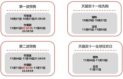 第一波预售于10月21日正式开启,但预售会场在10月20日中午12点就可以浏览,大家可以提前加购。预售期间有以下福利和玩法、天猫双十一红包购物津贴优惠规则: