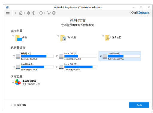 选择好恢复内容后,要选择恢复位置,可以选择共同位置或各个磁盘,这里比如选择E盘,然后单击右下角的扫描按钮,如下图所示。