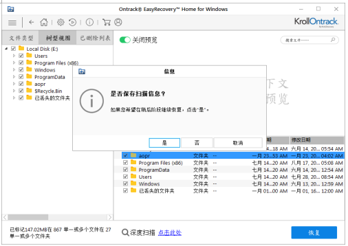 接着进入到查找文件阶段,这里不需要任何操作,只需耐心等待,扫描完成后会出现之前删除的文件和文件夹,此时如果要关闭该软件,就会弹出提示框:是否保存扫描信息?