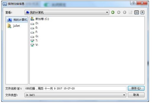 如果要稍后继续恢复,就单击“是”,弹出保存扫描信息窗口,选择合适的位置保存即可,这里文件名称和文件类型一般默认,也可以修改,直接单击保存即可。