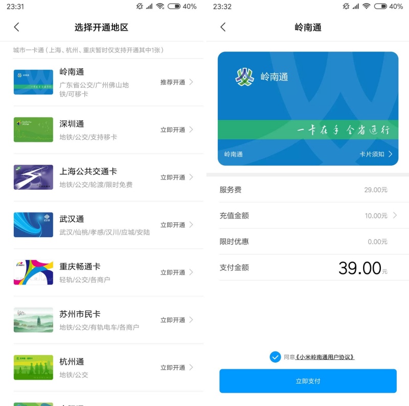 小米很早就支持了包括广东岭南通在内的多个城市的交通卡服务,只要你的小米手机支持 NFC,那么就可以通过小米钱包实现快速开卡。虽然如果恰好遇上促销活动,还可以免去开卡的手续费。