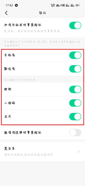 3.然后在隐私中,设置加好友方式,开启或者关闭对应的权限,其他好友就无法通过这些方式向我们发送好友请求;