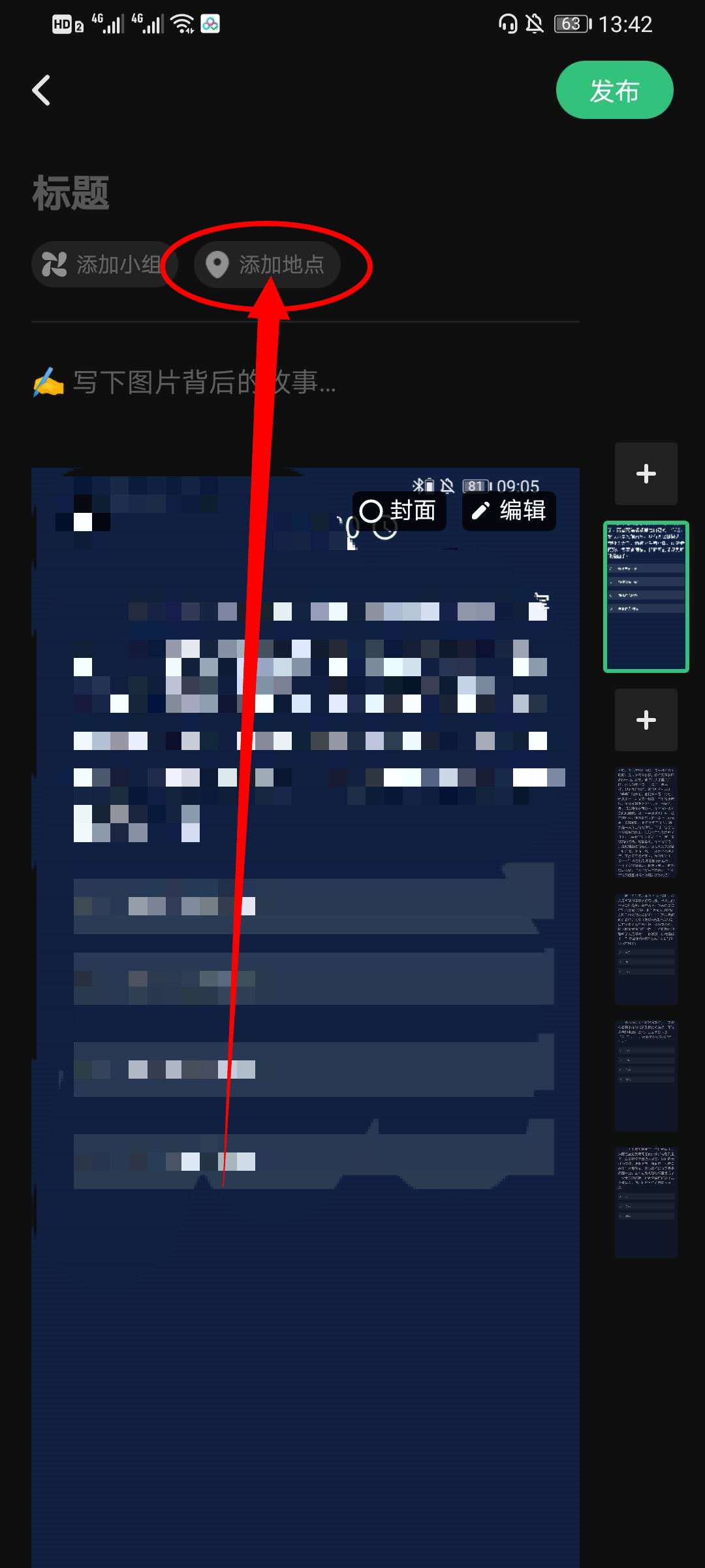 3、在内容编辑界面点击左上方的添加地点,进入定位。