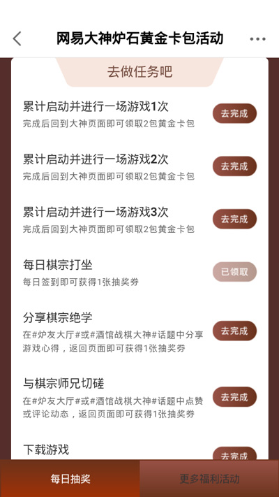 与棋宗师兄切磋:在#炉友大厅#或#酒馆战棋大神#话题中点赞或评论动态,返回页面即可获得1张抽奖券;