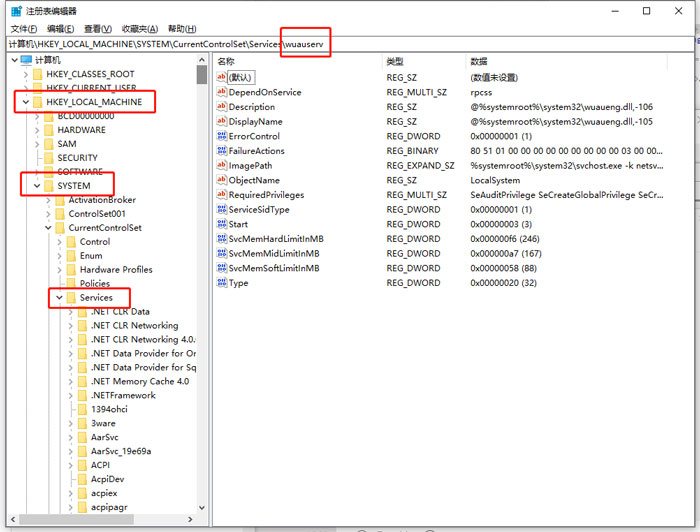 4、同样按WIN+R,输入regedit,打开注册表,在HKEY_LOCAL_MACHINE中找到SYSTEM,在子文件夹中找到CurrentControlSet文件,打开其中的Services文件,在其中找到wuauserv文件夹;