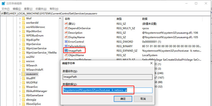 5、接下来,打开你之前服务中开启的图片中有一个“可执行的文件路径”(步骤2),在注册表中,找到数据和这个地址相同的子项,我的是Imagepath和它同路径,在这个路径c盘SYSTEM32里建个空的文件夹,随便命名,比如NO.exe,然后将那个项目的路径(最好先复制下来存到别的地方,以后方便改回来)改成no.exe;