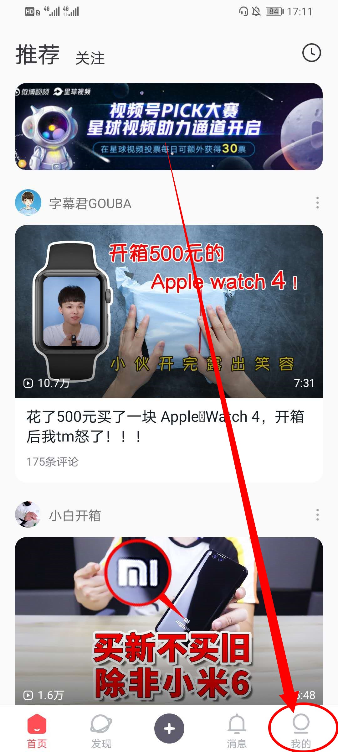 1、打开星球视频APP,在首页点击右下方的“我的”,进入我的界面。