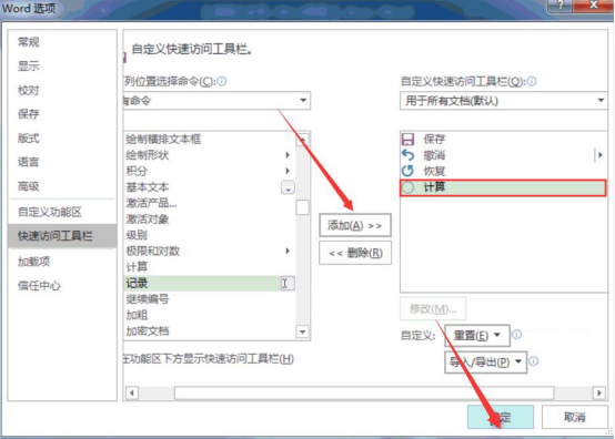 4.再点击界面中部的“添加”按钮,此时,word计算器便被添加至word的快速访问工具栏,并点击“确定”按钮。