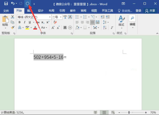 5.接着,我们回到word,可以看到在快速访问工具栏中多了一个圆圈的图标,它就是word计算器。我们将需要统计的数据选中,再单击word计算器按钮,如下图。