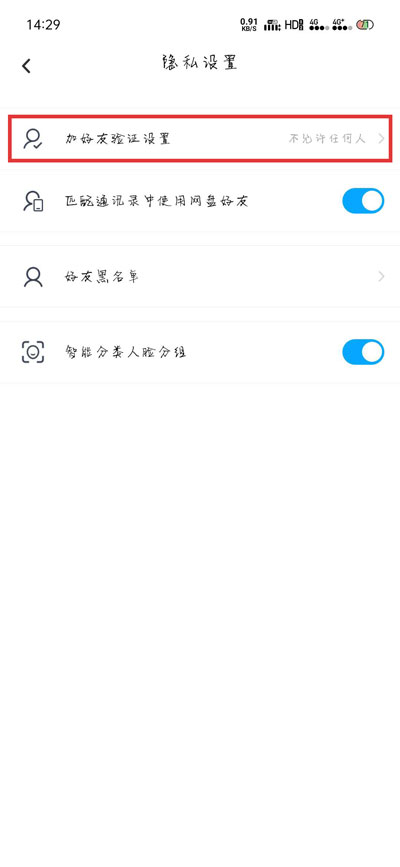 3、此时可以看到【加好友验证设置】设置的是“不允许任何人”,点击进入设置;