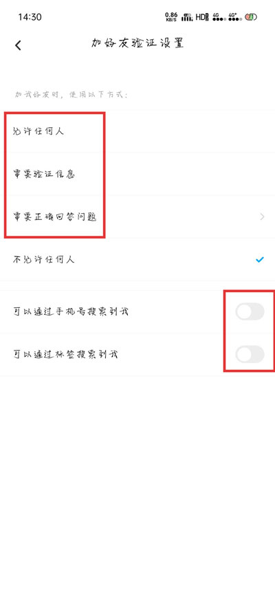 4、最后切换为【允许任何人/需要验证信息/需要正确回答问题】等方式,将下方的【可以通过手机号/标签搜索到我】功能打开即可;