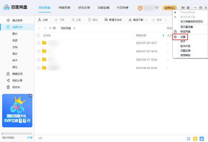 5、接下来以PC端的百度网盘为例,打开并登录百度网盘,点击右上角的齿轮【设置】,选择【设置】;