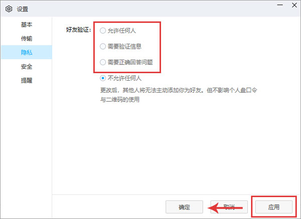 6、在设置的左侧切换到【隐私】设置,然后选择【允许任何人/需要验证信息/需要正确回答问题】等选项,点击【应用 - 确定】即可;