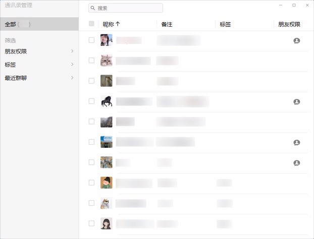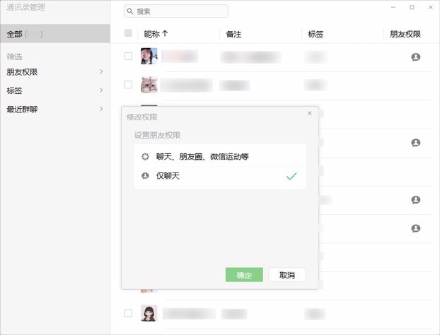 用户可以进行通讯录管理,比如还支持设置朋友权限,包括聊天、朋友圈、微信运动等,仅聊天。