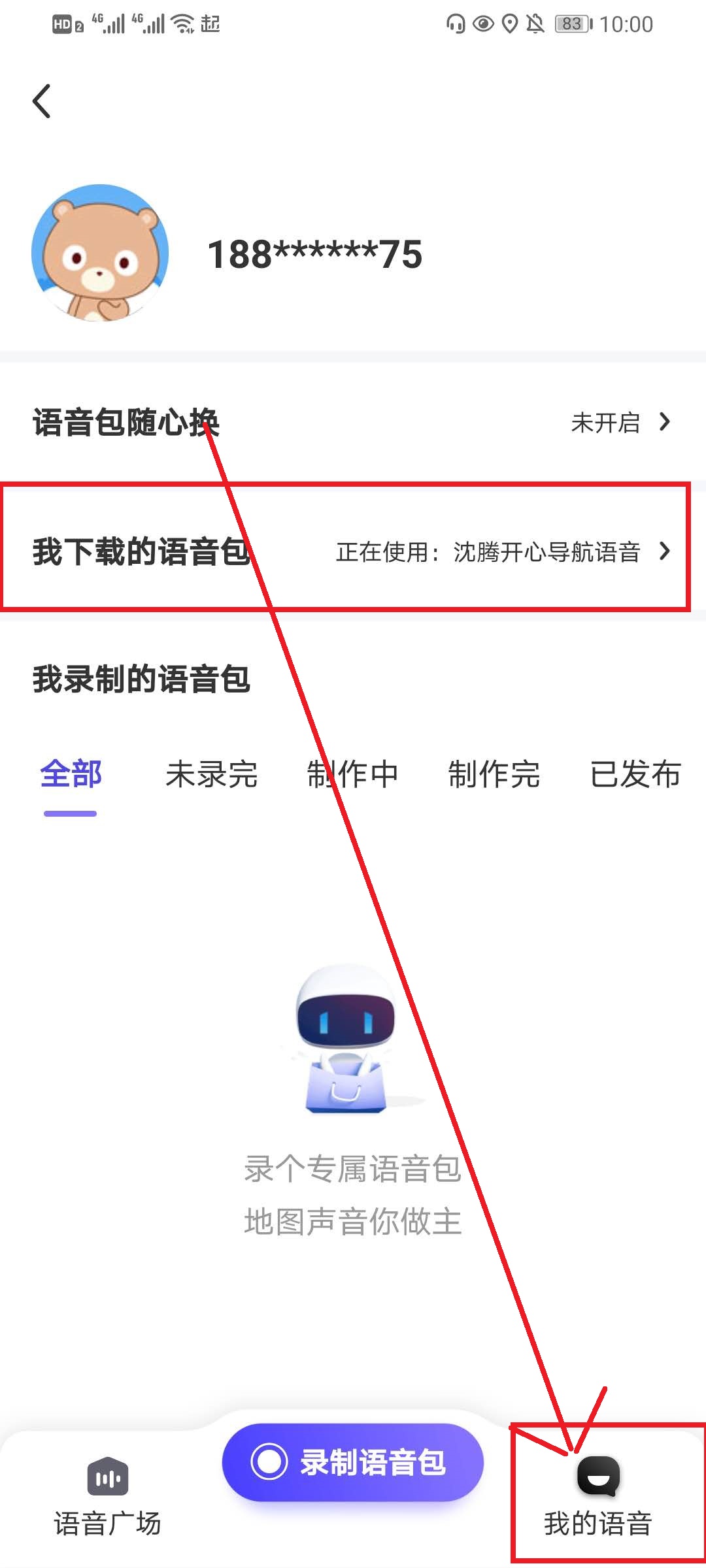 4、点击下载后会默认使用,我们想要更换的话可以点击界面右下方的我的语音,在我的语音界面点击“我下载的语音包”,进入设置。