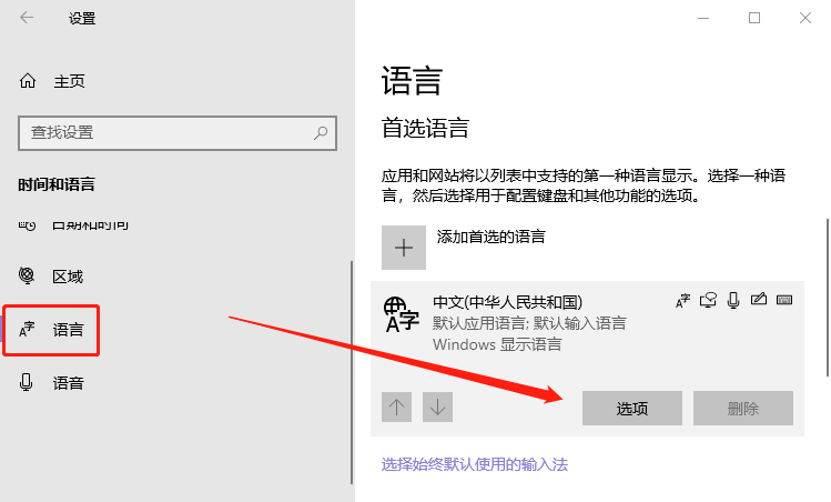 3、然后在左侧切换到【语言】,在右侧下滑点击【中文】,选择【选项】;