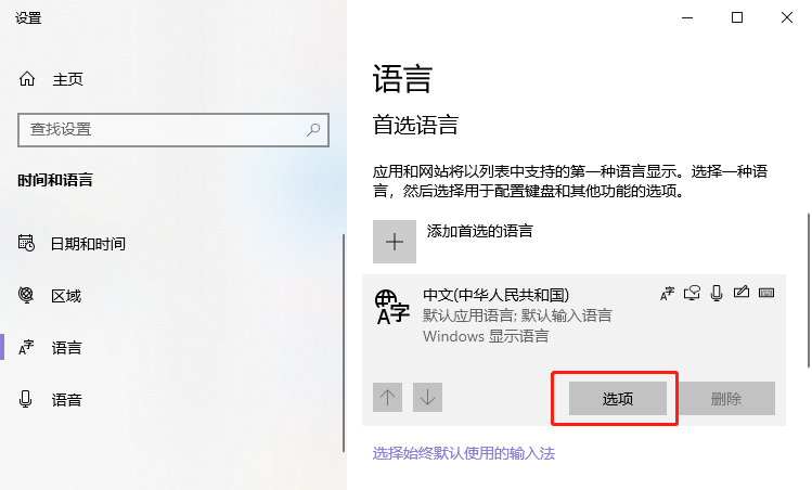 2、进入语言设置之后,在右侧下滑点击【中文】,选择【选项】;