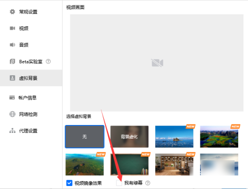4、最后在选择虚拟背景时,勾选下方的【我有绿幕】;