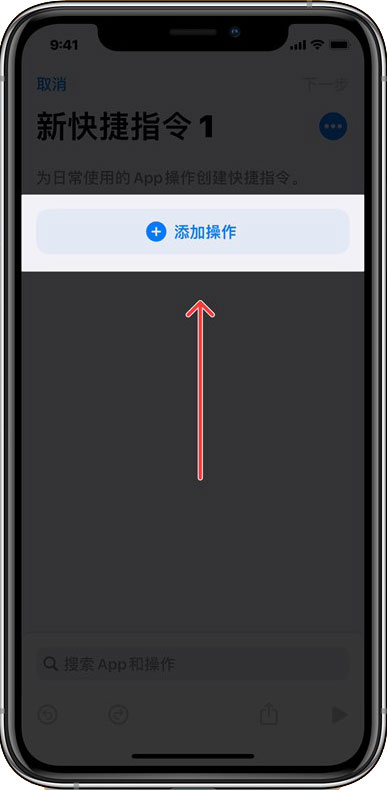 3、进入新快捷指令页面后,点击【添加操作】一项;