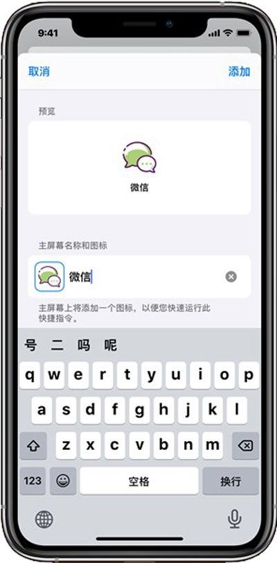 10、修改该指令在桌面上的名称,点击右上角的【添加】;