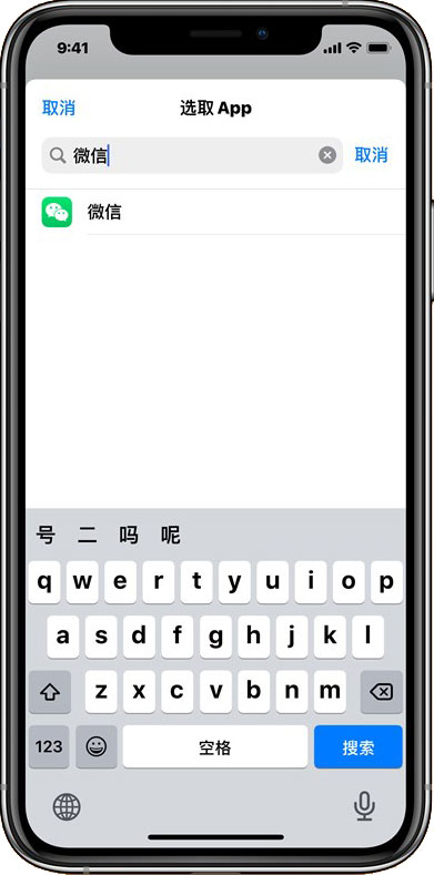 6、输入需要修改图标的软件名称,以微信为例,搜索微信,选择;
