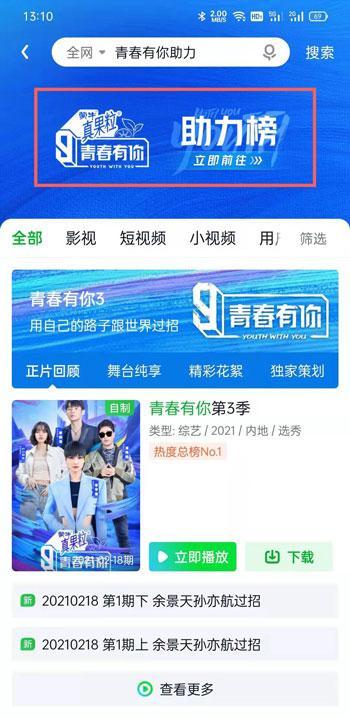 2、搜索【青春有你助力】,或者搜索【助力榜】,点击青春有你3助力榜进入投票页面;