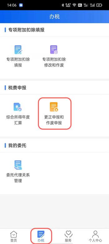 2、然后在下方的功能栏中点击【办税】选项,选择【更正申报和作废申报】一项;