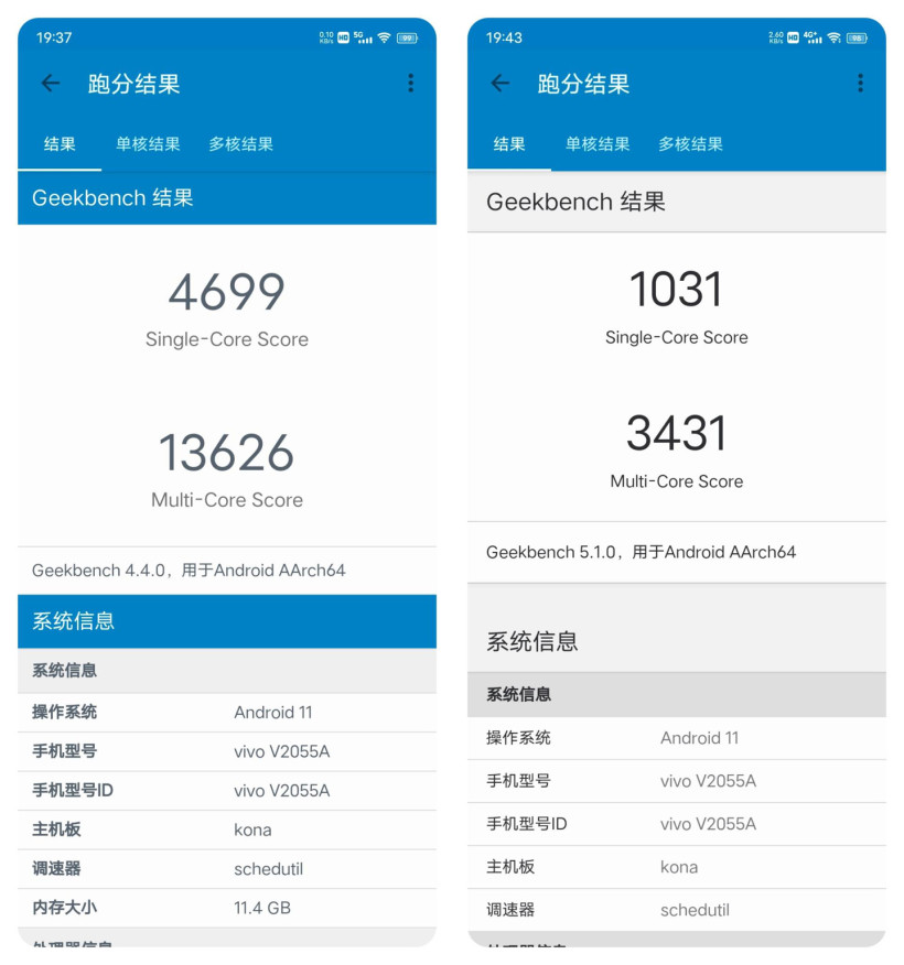 通过 GeekBench4 跑分获得,iQOO Neo5 单核心达到了 4699 分,多核心达到了 13626 分;通过 GeekBench5 跑分获得,iQOO Neo5 单核心达到了 1031 分,多核心达到了 3431 分;