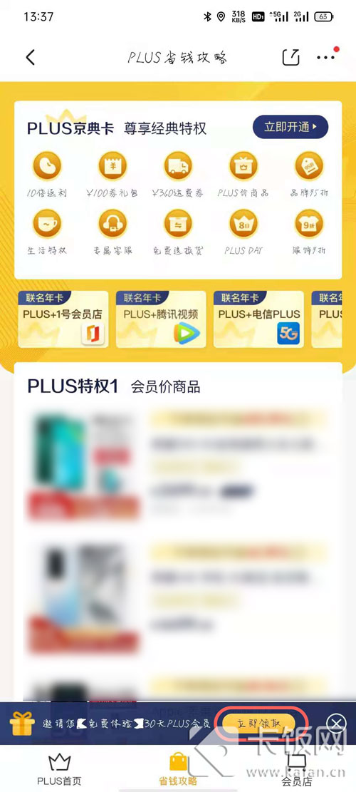 2、在下方点击“邀请您免费体验30天plus会员”提示窗口中的【立即领取】;