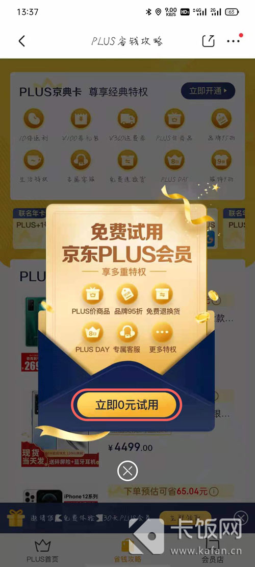 4、在使用京东plus会员详情页面,点击【0元试用30天】按钮;