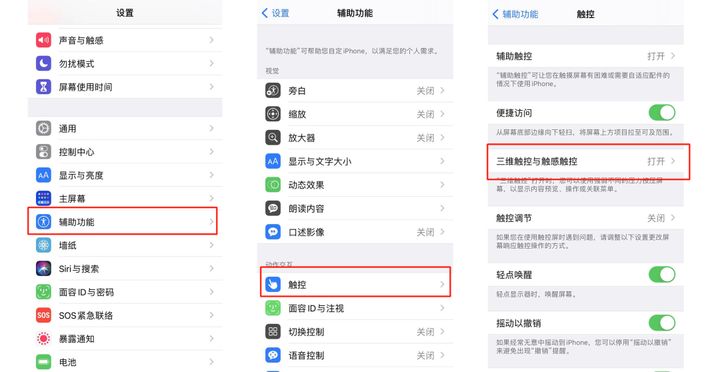 2、然后打开手机,「设置」-「辅助功能」-「触控」-「三维触控与触感触控」打开;