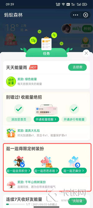 2、在蚂蚁森林页面,根据【任务】领取到千年山桃树装扮,点击这里查看领取教程;