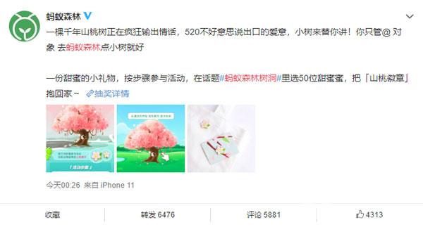 5、在微博参与#蚂蚁森林树洞#话题 ,将树洞的告白语截图发微博,有机会获得山桃勋章。