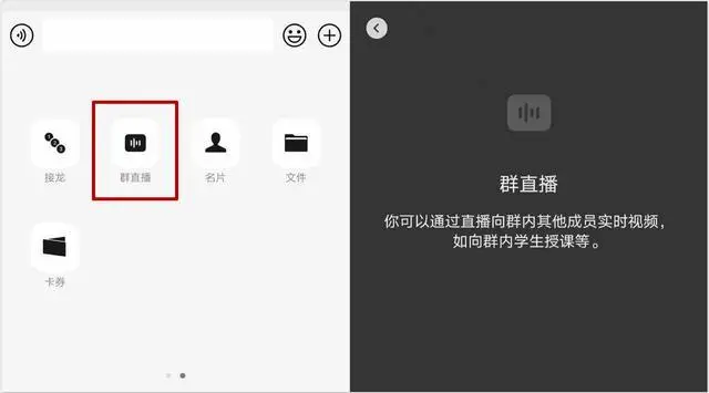 4、最近微信除了看一看的灰度外还有群直播的灰度,在群聊中,点击聊天对话框中的“+”键后,出现群直播功能入口,该功能可以通过直播向群内其他成员实时视频。