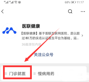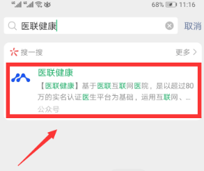 微信首页,点击搜索栏输入“医联健康”搜索公众号。