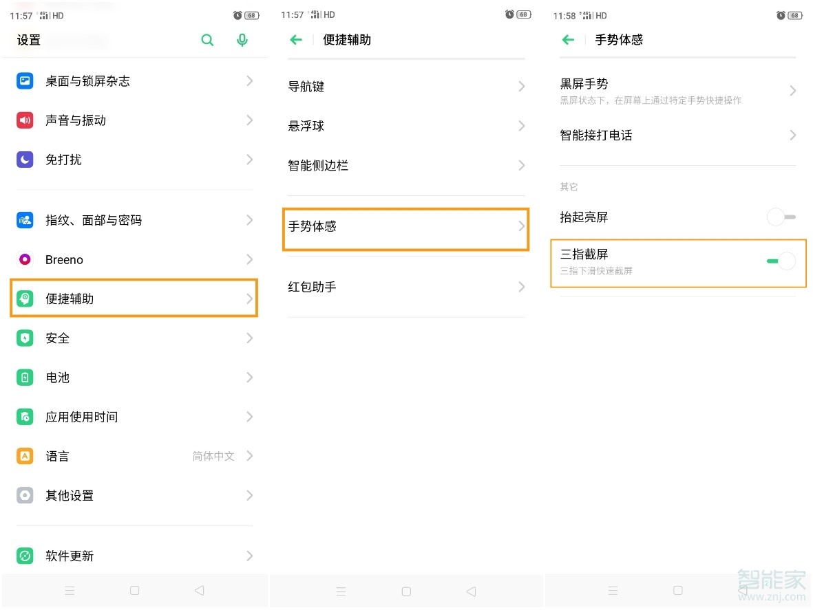 2、三指截屏:前往「设置 > 便捷辅助 > 手势体感」,打开「三指截屏」开关,即可实现三指下滑快速截屏。
