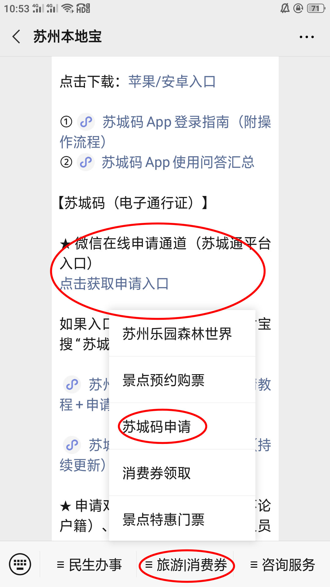 1、关注苏州本地宝微信公众号,点击旅游,在出现的选择中找到苏城码申请,点击后公众号会发送信息过来,向上翻找到微信在线申请通道,点击申请。